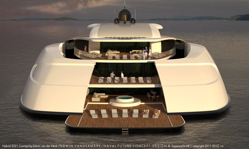 After his return home into his studio VANDERMARK, the designer started sketching and digitally developing what is now called ‘The Hybrid 2021’ superyacht concept. Hybrid 2021 portrays a super yacht completely out of the ordinary, representing a new way of thinking in the future direction of superyacht design.