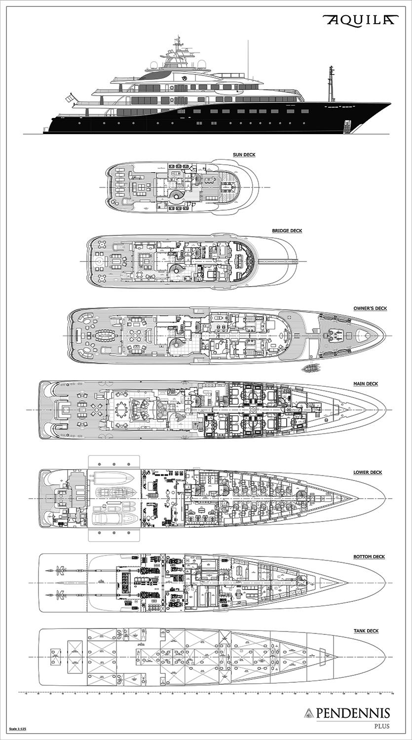 The classic design features a full beam owner’s stateroom with panoramic views, en-suite guest cabins, plenty of lounges and entertaining areas. The outside space, spread over four decks, is large enough to accommodate a 10m tender, spa pool or a swimming pool and helipad.