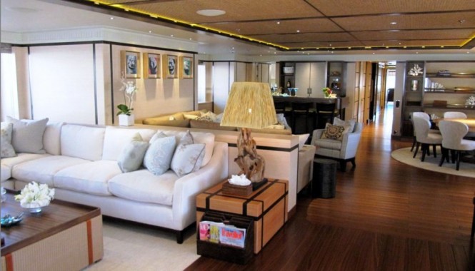 The main saloon is the more formal area of the yacht, neutrally decorated. Forward there is a dining table that seats 14. The focus is inwards and on the occupants rather than outwards – even the tray ceiling draws the eye to the centre of the room.
