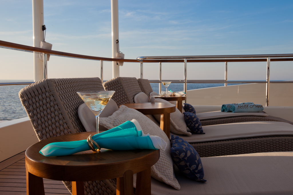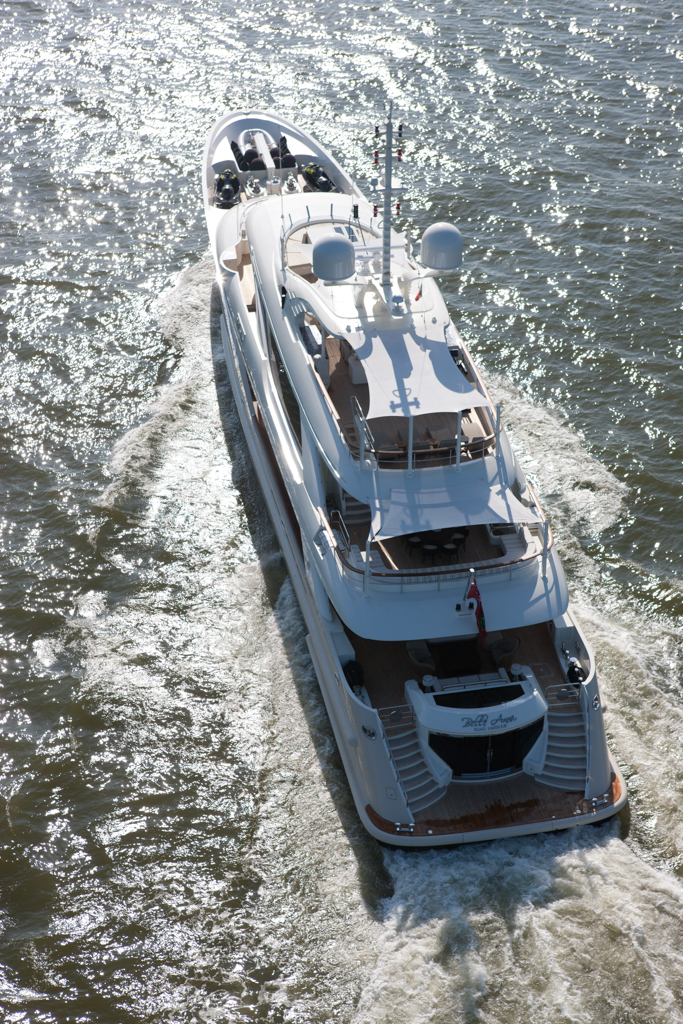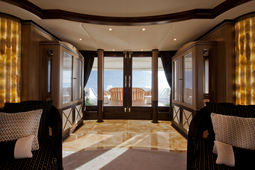 Spreading over three spacious decks, luxury superyacht BELLE ANNA accommodates twelve guests in six staterooms, including one master and five guest. The interior can be described as classic Art Deco with materials such as goat skin, gold leaf, stingray, great use of leather and leather work such as eel, ostrich, anaconda and other embossed leathers. Other particular details include the use of glass, such the Lalique etched glass on door. All bathrooms have been personalised with a standing washbasin on a marble top and different combinations of marble and mosaic. Amongst the notable features of this exquisite vessel belongs the versatile beach area accessible from the beach platform thanks to two wide and curved glass doors. BELLE ANNA superyacht is powered by twin Caterpillar 3512C 1,230 Kw at 1800 RPM engines, reaching a maximum speed of 16.9 knots. For additional comfort, she was fitted with a pair of Quantum Zero Speed stabilisers to ensure a comfortable experience on board.