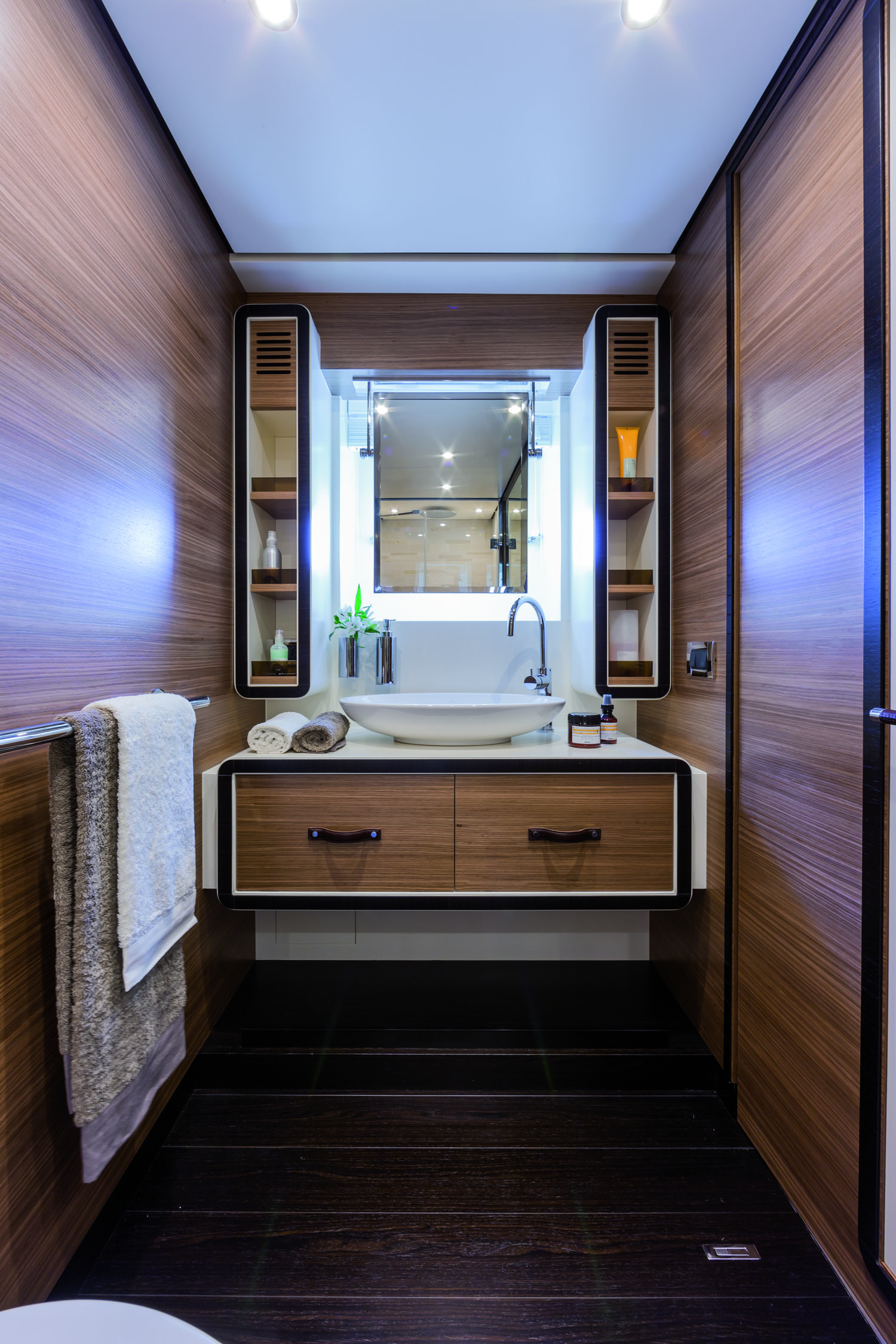 The double access from the aft deck and the galley located on the main deck, provides the Owner with the maximum privacy. The layout of the lower deck boasts accommodation in four guest cabins with heads as well as the possibility to change a guest cabin into an additional relaxation area, which can be directly accessed from the master suite.