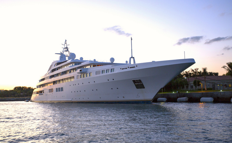 The impressive and eye-catching vessel spreads over seven amazing decks, and provides tastefully appointed accommodation to an amazing number of 24 guests and a crew of 88. In addition, guests aboard this unique vessel can enjoy a large swimming pool, barbecue area, cinema, disco, gymnasium and a great variety of water toys. There is even a 21,30m-wide atrium, a landing platform for a Blackhawk helicopter and a garage for a submarine.