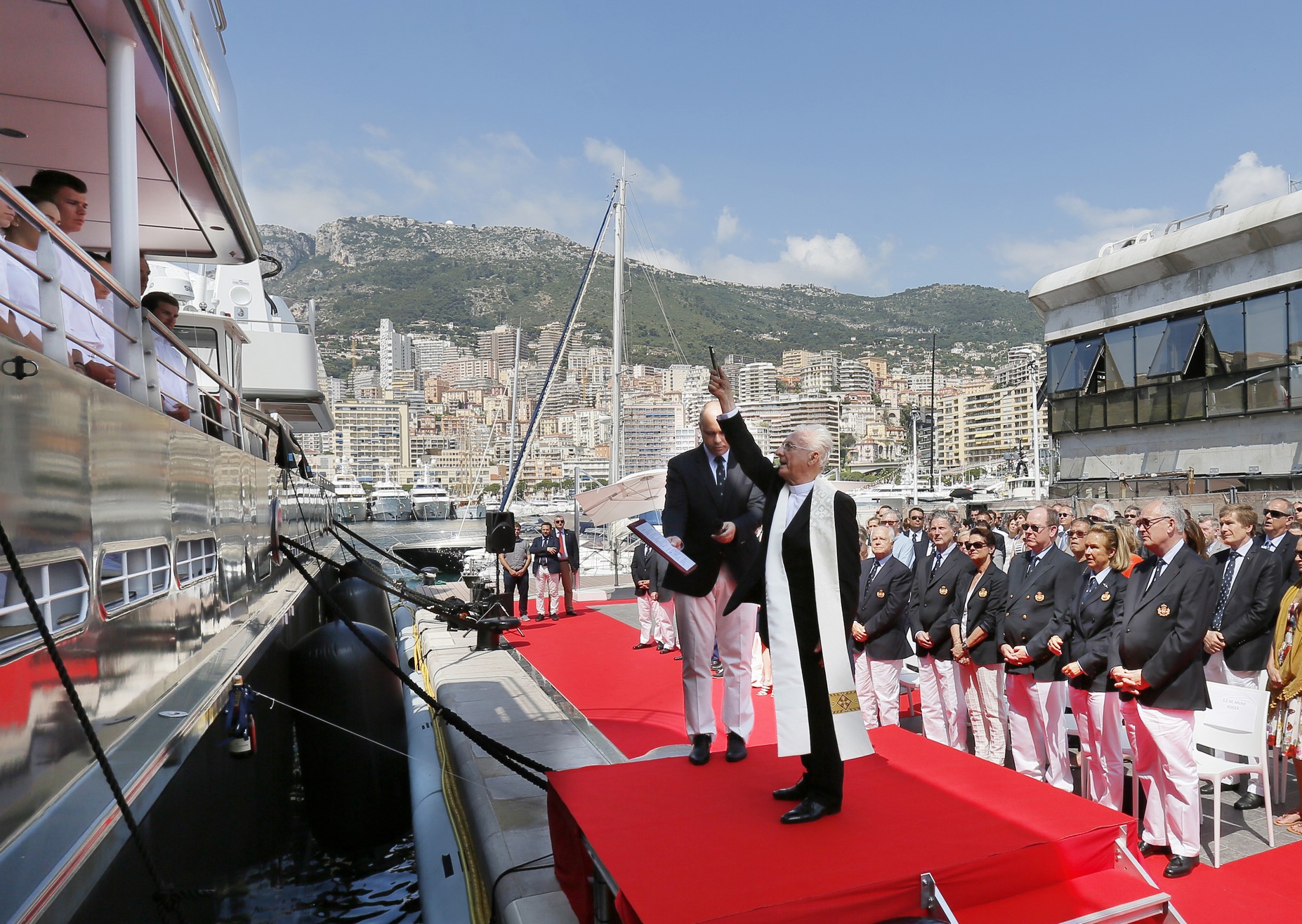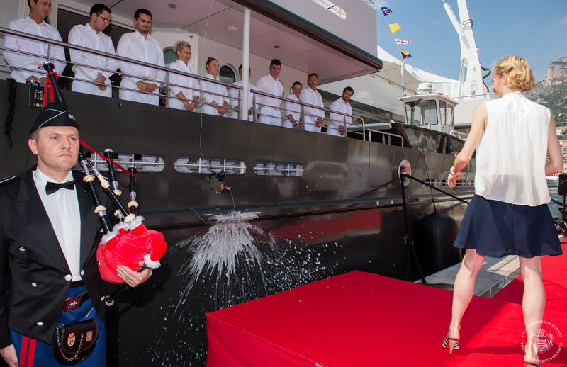 Both a private vessel as well as multi-purpose vessel for cruising all oceans and in all weathers, the impressive 77-metre explorer yacht YERSIN was blessed by His Grace René Giuliano, Vicar General of Monaco, at a ceremony in the Principality of Monaco, attended by HSH Prince Albert II. As tradition dictates, YERSIN yacht’s godmother and daughter of the owner, broke a bottle of champagne against the hull, to the tune of When the Pipers Play, performed on the bagpipes by Chief Warrant Officer Olivier Dréan, conductor of the Prince of Monaco’s military band, Fanny Fiat.