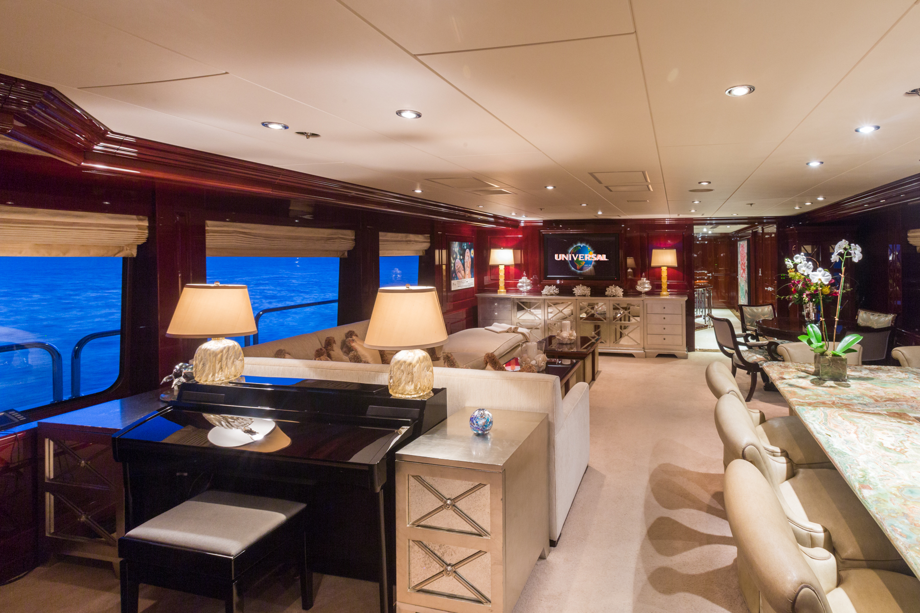 Never miss a moment of the action or the beauty of your surroundings with life outdoors in the sunshine and shade: The swim platform offers easy access into the water and a place to stretch out in the sun while watching younger guests on the water toys. Alternatively, the main deck aft is completely covered and boasts a spacious C-shaped sofa and two large tables for casual relaxation, served by a port-side bar. Sun loungers are placed along the upper deck aft, and when guests have had their fill they can dine alfresco at the grand table to serve 12 before returning to the loungers for a nap.