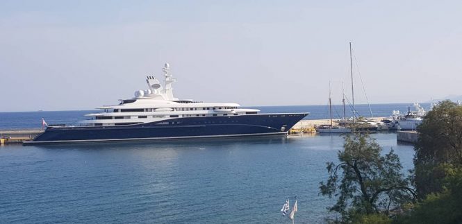Luxury megayacht AL MIRQAB was spotted at Piraeus Port in Athens, Greece. She is one of the largest yachts ever built. Delivered in 2008, she was designed by Tim Heywood, while Kusch Yachts developed her naval architecture.