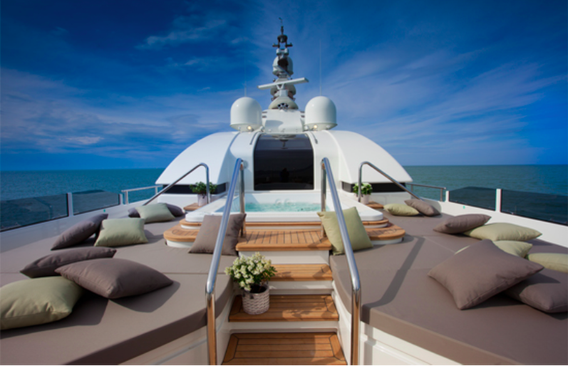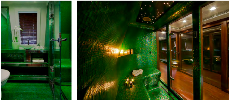 J’Ade superyacht’s upper deck comprises an outdoor dining table for 14 people, complete with a rotating servant. Indoors, a custom-made dining table made of polished rosewood and brown galuchat leather can also seat 14 people. The lounge also features two large sofas by Minotti and a Swarovski chandelier. The sun deck has a helipad and spa pool surrounded by sun beds. Indoors, a wellness area is complete with a floor-to-ceiling green Sicis mosaics Turkish bath and a gym.