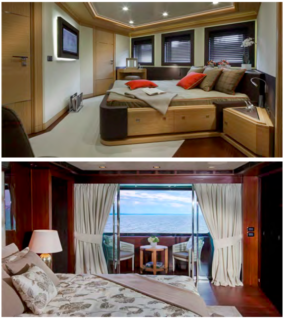 The glamorous owners suite features a balcony, furniture clad with white-silver nuance coconut leather by Fendi Club House Italia, a silk carpet and textiles and curtains made of cashmere by Loro Piana. The adjacent bathroom, furnished with Afyon and Emperador dark marble, features an anti-steam mirror concealing a television, customized petal shaped washbasins and an oval bathtub by Boffi.