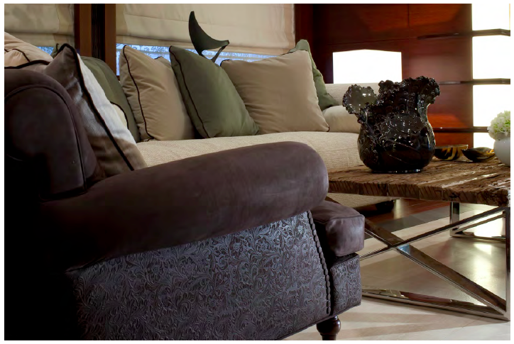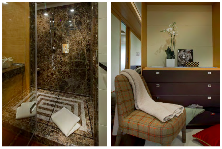 The interior style of J’Ade yacht is classic and modern, elegant and refined, with a fusion of materials including wood, leather, marble and metals. Canaletto walnut and polished rosewood are particularly prevalent, with hardwood floors made of wide Afromosia strips and white Tai Ping fitted carpets. As the name suggests, the colour jade is accented in different shades throughout the yacht’s décor.