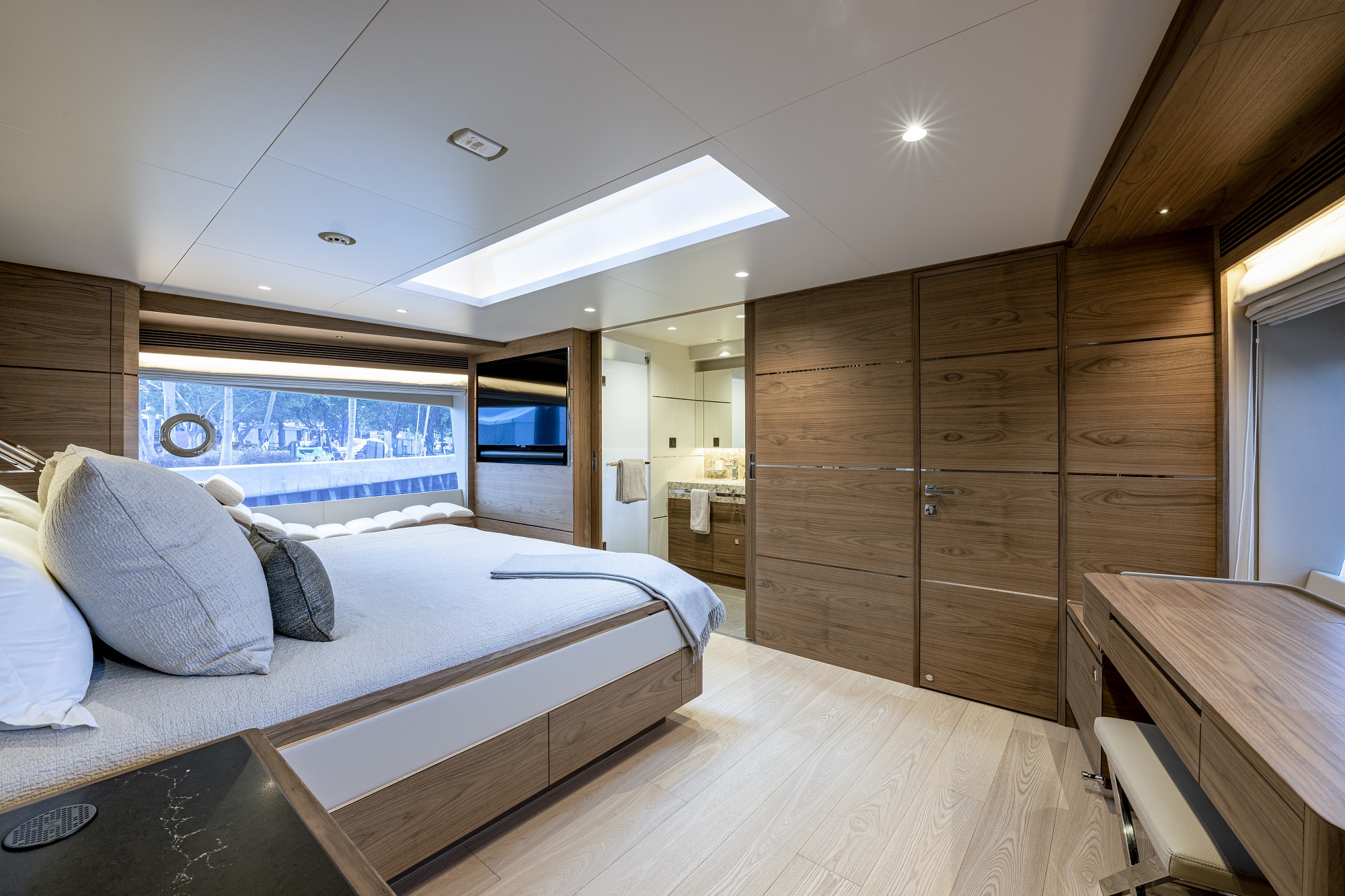 The full-beam master stateroom is positioned forward on the main deck and is filled with natural light afforded by the large windows and skylight. There is a generous ensuite with double vanity sink, separate head cubicle and shower. Three spacious ensuite VIP cabins are located on the lower deck, two amidships and one forward in the bow.