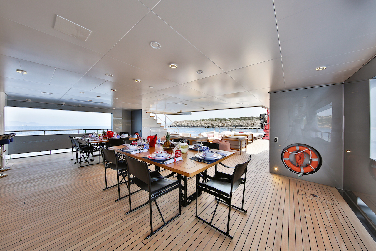The main deck has a half-length open space that can be used for numerous purposes due to its flexible layout, while outside there is a large sunpad areas that conceals a 9m/29ft tender below. A bar and entertainment system make this outdoor space a desirable place for social gatherings day or night.