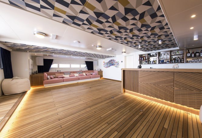 The sea platform on the lower deck has a 55m²/592ft² soundproofed entertainment area and a spacious kitchen for serving guests at parties.