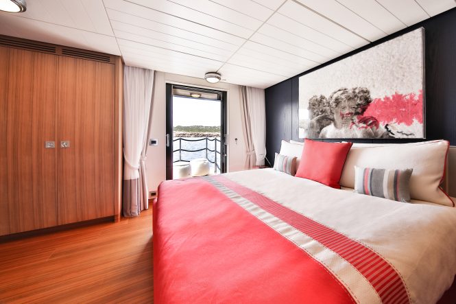 In addition to the Owner’s suite, the accommodation provides for eight guests over four double cabins, two of which are on the main deck and two on the lower deck that have fold-down balconies for a close connection with the sea.
