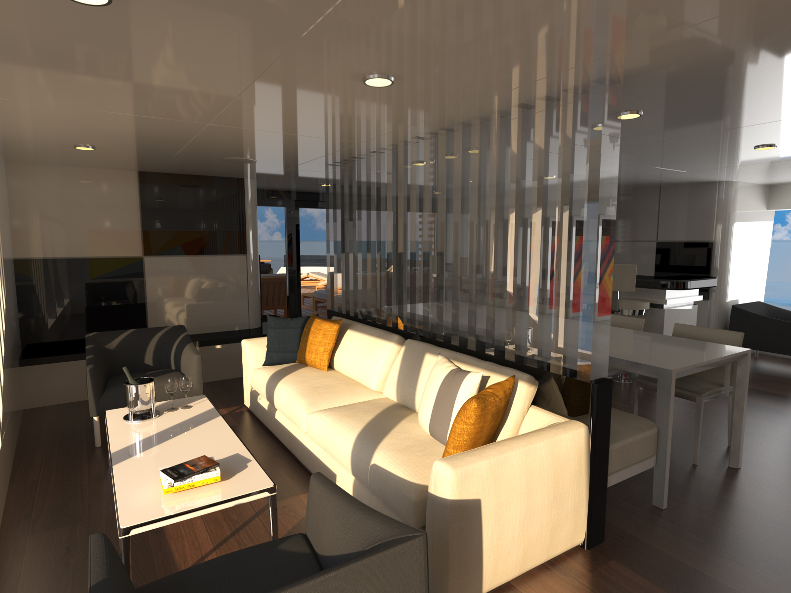 A broad and deep swim platform creates an ideal space to sunbathe beside the water and only a few steps connect to the main deck aft, where there is a sofa/sunbed at the centre of the stern and sun loungers along the bulwarks to either side. The area has the potential to be used as an alfresco cinema, alfresco dining area or for exercise. Corner sofas and coffee tables finish off this outdoor space as guests are led into the main salon.