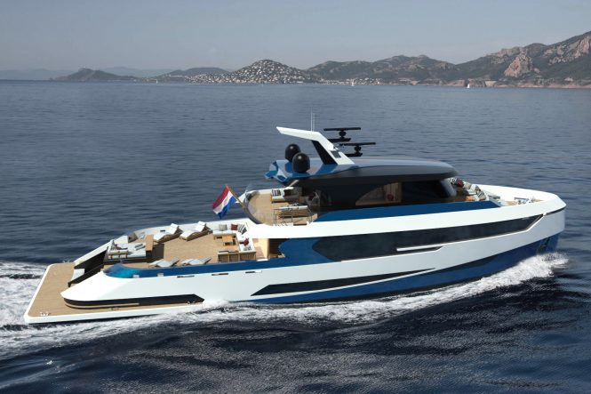 Casper Marelis of Diana Yacht Design produced the exterior styling and took his inspiration from the car industry to produce a robust exterior appearance and eye-catching paint job in blue, black and white. Open decks and large windows characterise the design, which are accentuated by the forward superstructure and vertical bow which both lend M/Y BLUE ANGEL the appearance of an explorer yacht.