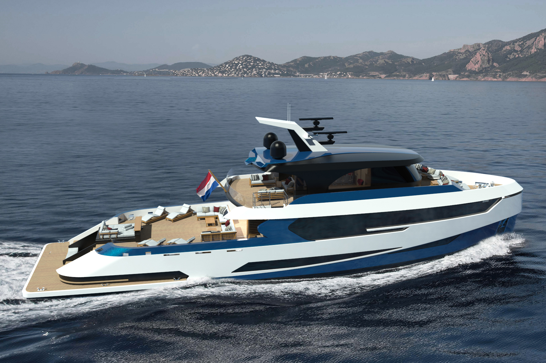 M/Y BLUE ANGEL can use hydrogen as its sole fuel as she cruises with hotel loads for up to 18 hours. For more extensive journeys, she is equipped with a diesel engine that is capable of crossing the Atlantic.