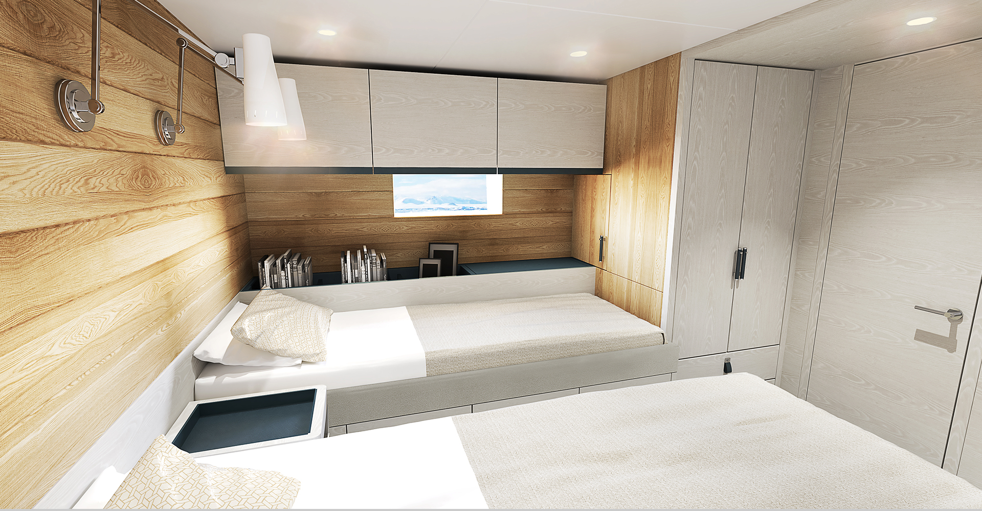 Storage has been well considered for extensive journeys to destinations with varying weather and temperatures, and behind the wardrobe and under the lift-up mattress there are additional lockers for storing winter gear or summer wear.