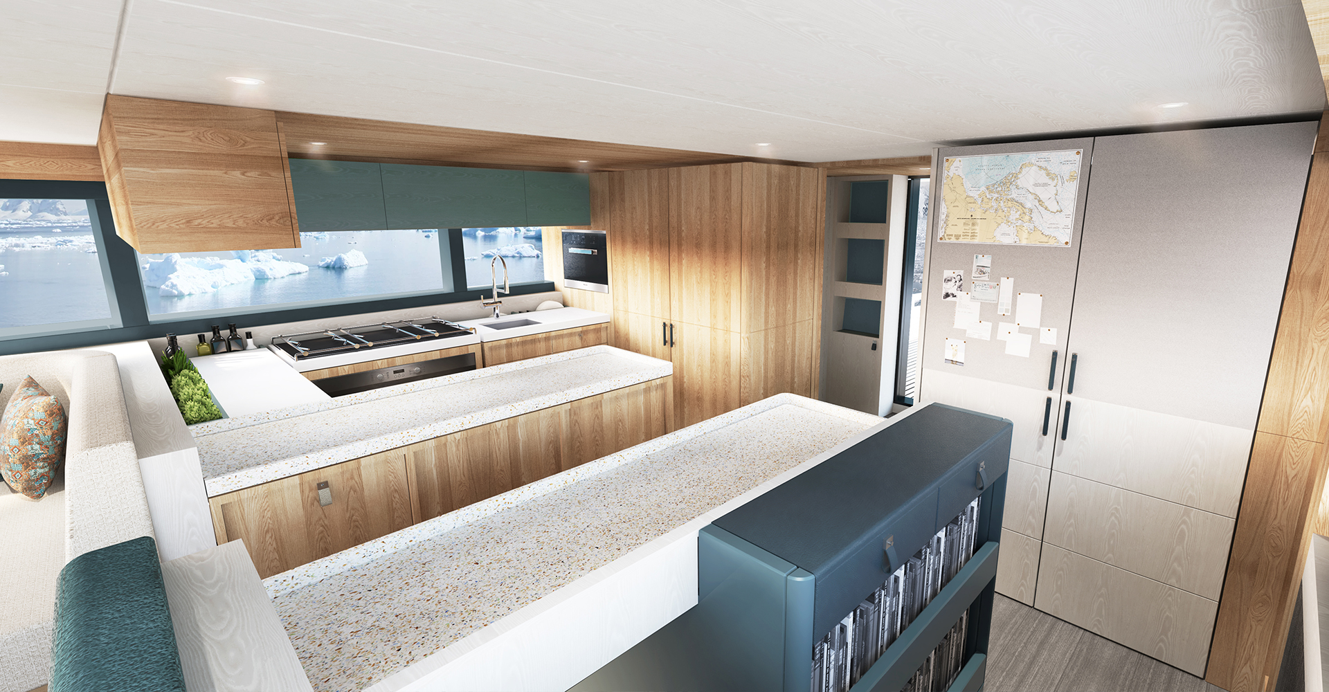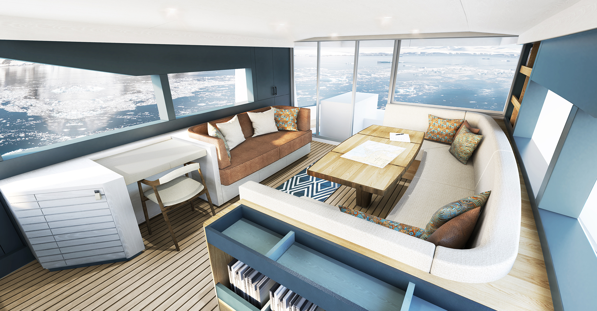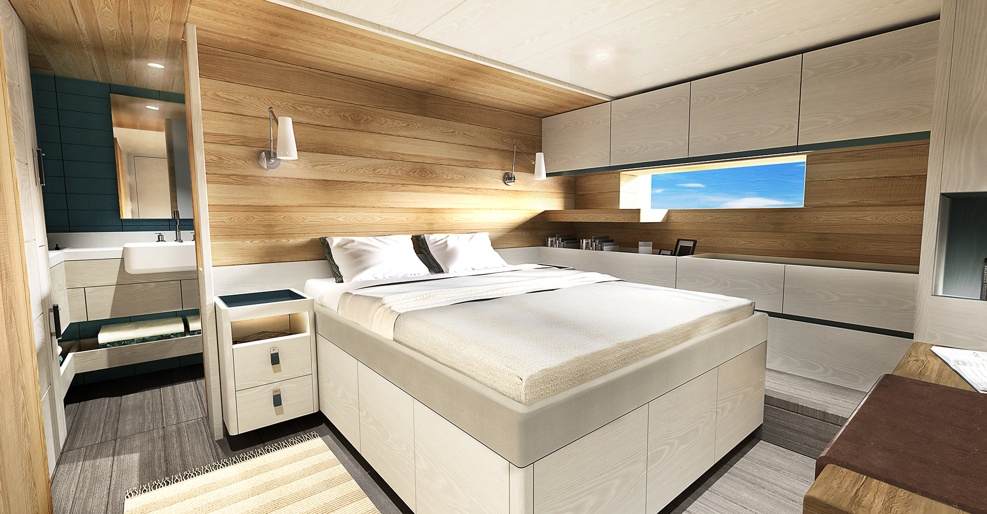 The Master suite can also be used as a private retreat for its occupants, offering a study/media area, a king-sized bed, an extra berth and an en-suite bathroom with a shower and steam room. Depending on which interior layout is chosen, up to 14 explorers can live aboard for expeditions.