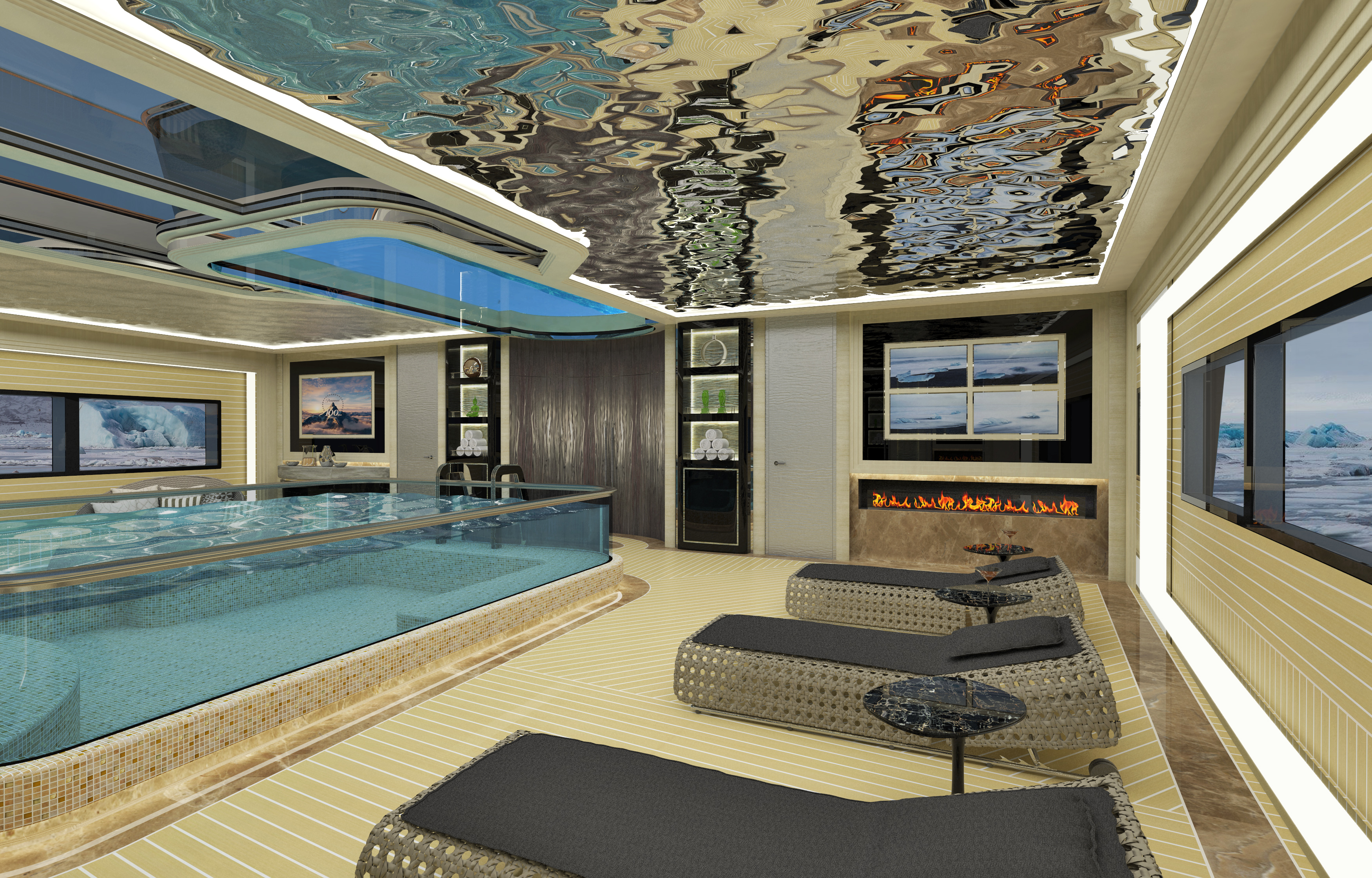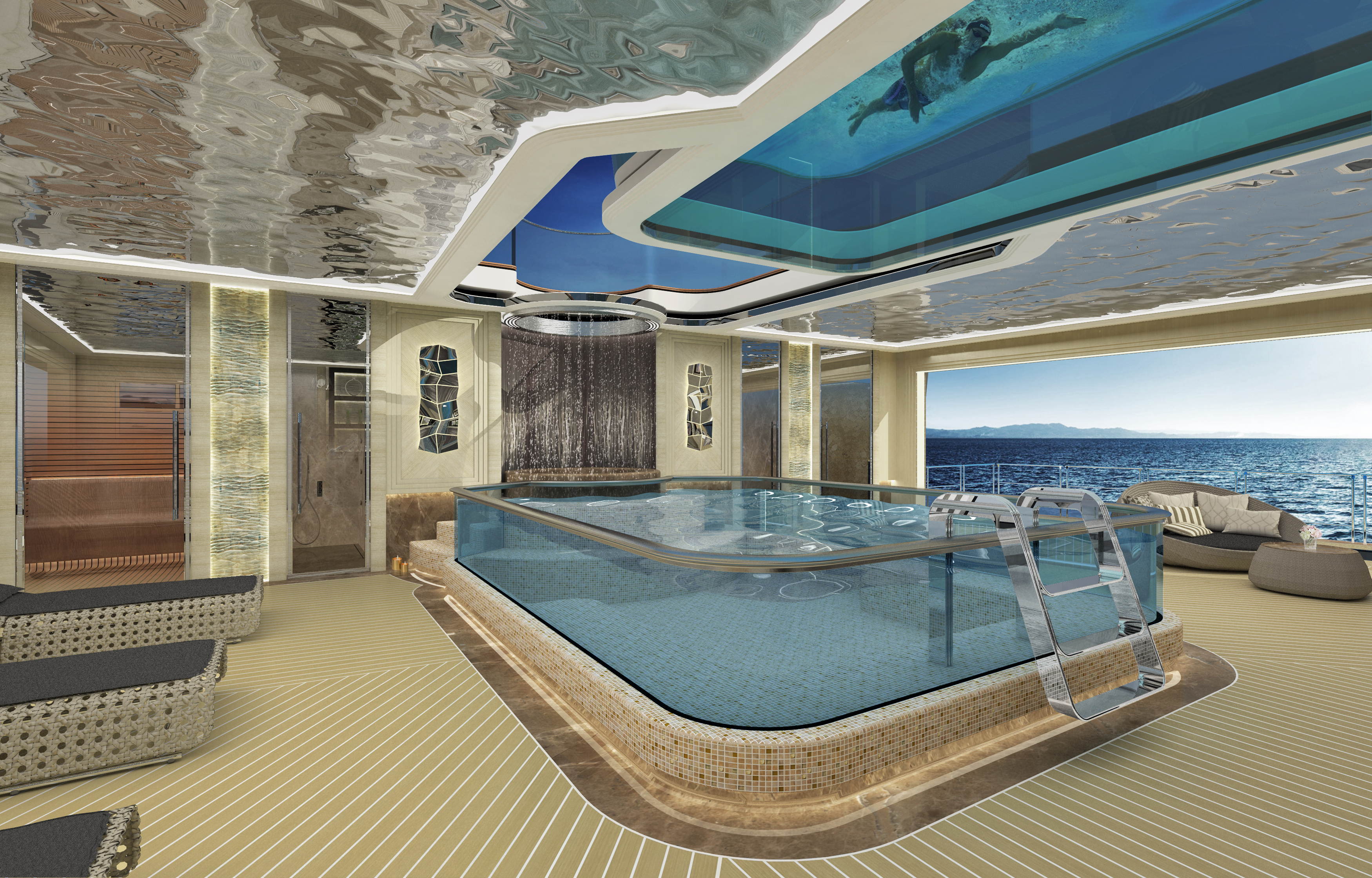 The design is inspired by Roman baths where the facilities are built around an open yard that can be used throughout the year. As a result, the glass-bottomed swimming pool on the foredeck dapples light onto the main deck interior below, and there is a fireplace and day beds for optimal use of the area regardless of the season or climate.