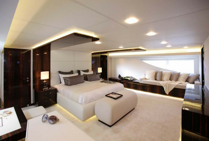For an excellent interior/exterior flow, there are large glass doors on the main as well as upper deck that can be opened entirely, across the full beam of the yacht. There is also a large sliding glass roof, of about eight square metres, providing the interior of the upper saloon with light and air. A dining area for eight can also be found on this level.
