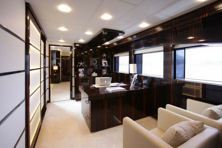 Accommodation comprises an owner’s suite located on the main deck, with a full beam bedroom as well as a study and a vary large en suite bathroom. The four guest cabins are near-identical and are located midship on the deck below. The friendly and professional crew is accommodated in three cabins in the bow and a mess seating eight.