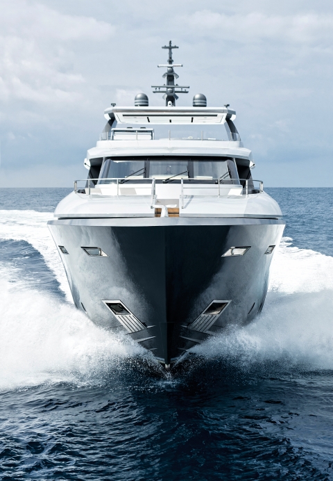Forward on the main deck the owner’s cabin finds place, taking the full beam of the Low Profile yacht and featuring large side windows which give natural light to the whole environment. On the floor the precious ivory and blue carpet acts as a “tray” to the four-poster bed with tufted headboard. The upper saloon covers the entire beam of the deck and it’s lightened by windows that span the entire length of the deck, delivering a sportier profile to the yacht.