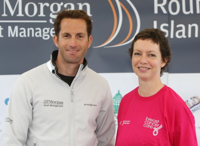 Breast Cancer Care team member Denise Shepherd with Ben Ainslie at the J.P. Morgan Asset Management Round the Island Race charity training day