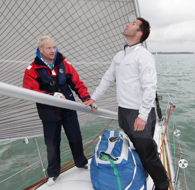Olympic Gold Sprinter Iwan Thomas, representing Macmillan Cancer Support with Ben Ainslie on the foredeck of The Ellen MacArthur Trust boat at the J.P. Morgan Asset Management Round the Island Race charity training day.