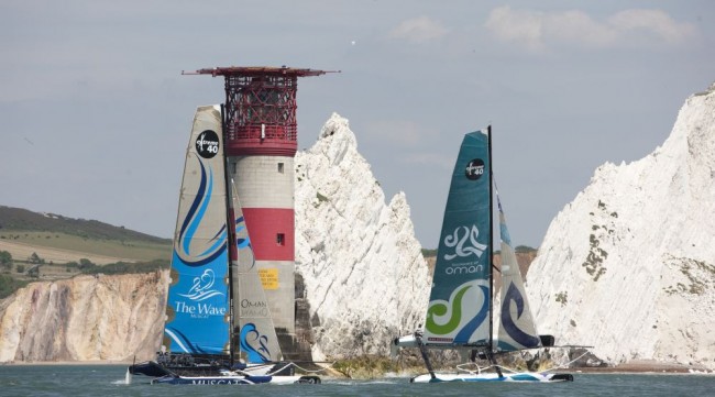 17th June 2010.Needles. Isle of Wight - "Oman Sail" Masirah & "The Wave Muscat" catamarans sailing close to the "Needles" during a training day prior to the start of the 2010 J.P.Morgan Asset Management - Round The Isl and Race - Images by mark Lloyd