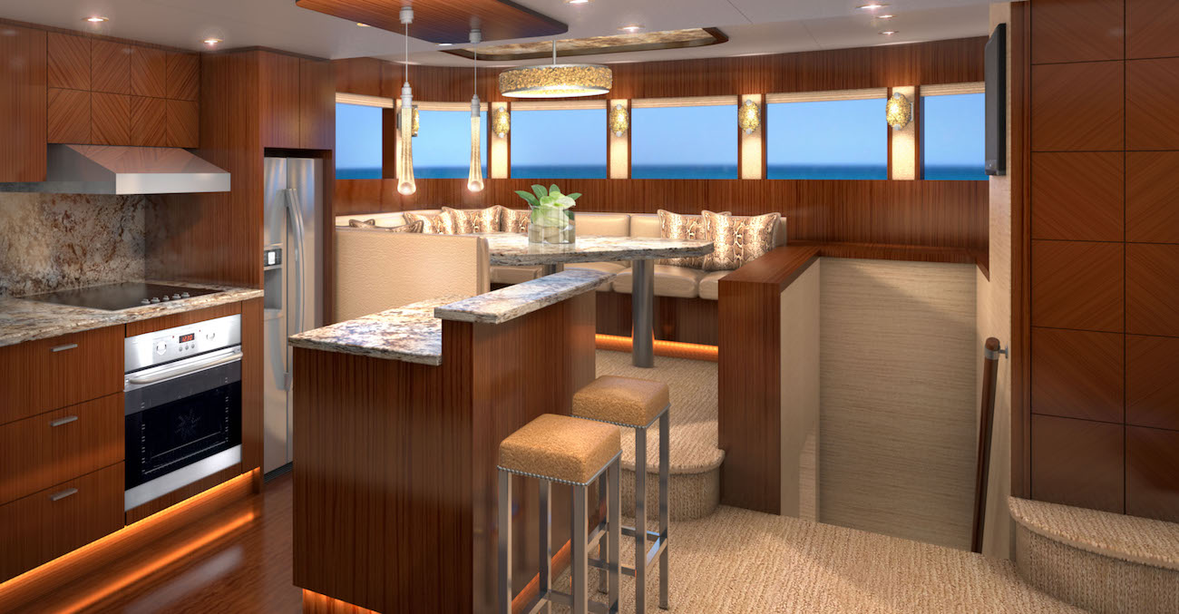 A country-style kitchen is placed forward on the main deck and stainless steel appliances are surrounded by marble counter-tops and back-splashes, and an island serves as a two-stool breakfast bar. The forward section is raised by a singles step and offers diners 180 views while savouring a meal at the marble table surrounded by an L-shaped dinette.