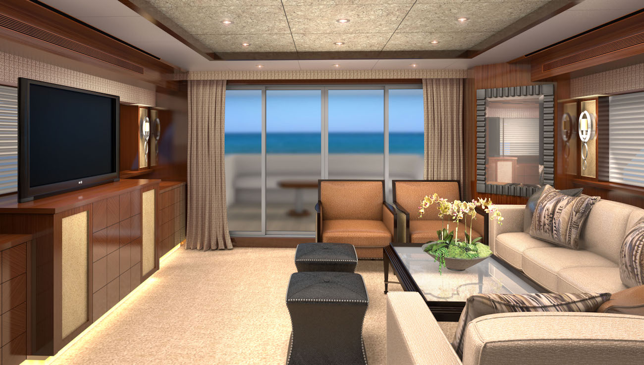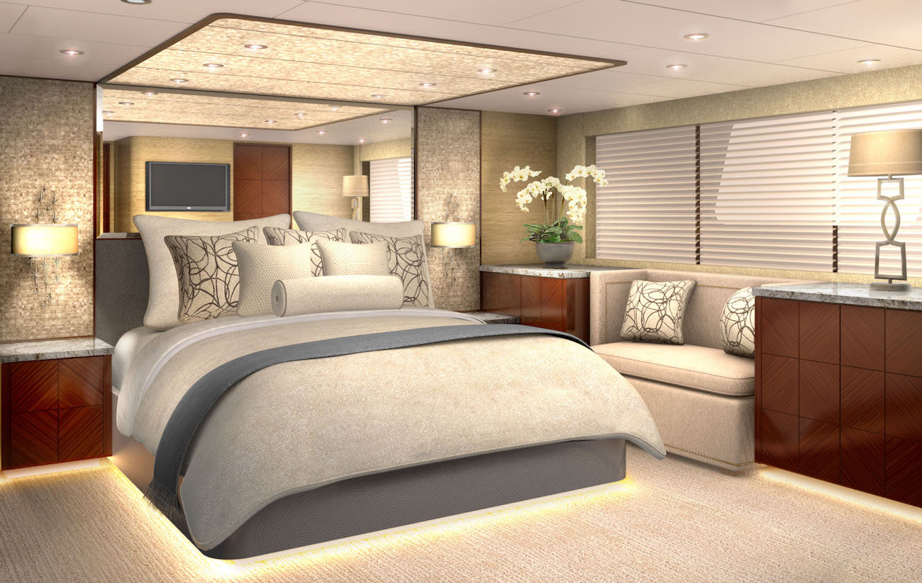 The lower deck will host four en-suite staterooms with the Master suite placed amidships to benefit from the full beam to add a large bathroom, writing space and walk-in wardrobe. The forward VIP stateroom uses an island berth and dressing table as well as having its own en-suite facilities. Between these two main bedrooms are the double cabins which instead can be twins, each with their own bathroom and the capacity for a Pullman berth.