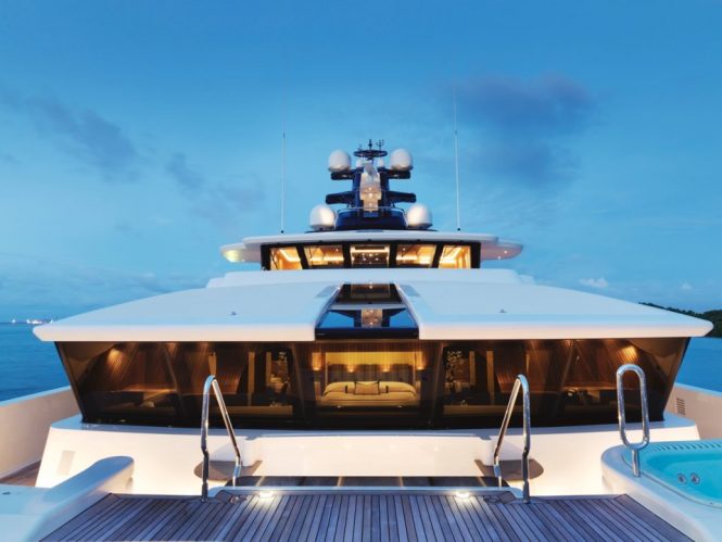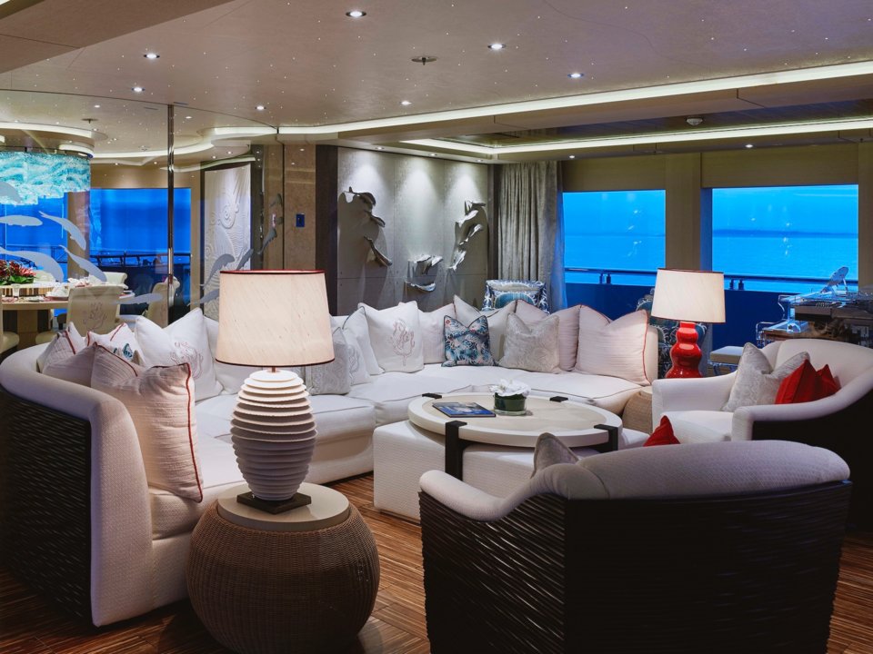This 91.5m/300.2ft luxury yacht from Oceanco is the ultimate indulgent treat for any celebration, and Kylie Jenner would have spent much of her time being pampered in the spa which has a choice of shower-plunge pool, sauna, steam room, massage room and hair salon to prepare her for the ultimate night out or the perfect selfie.