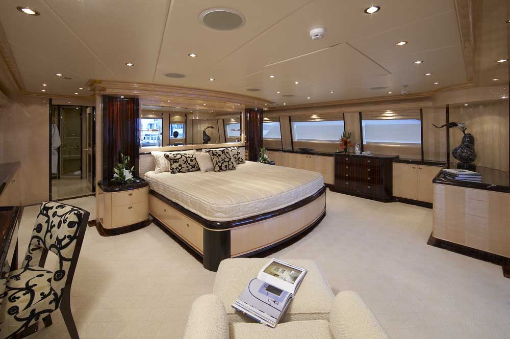 The upper deck is dedicated to the second master suite, complete with private exterior deck. On the lower deck is the VIP cabin offering a king bed which converts to 2 twins, a double cabin and a twin guest room.