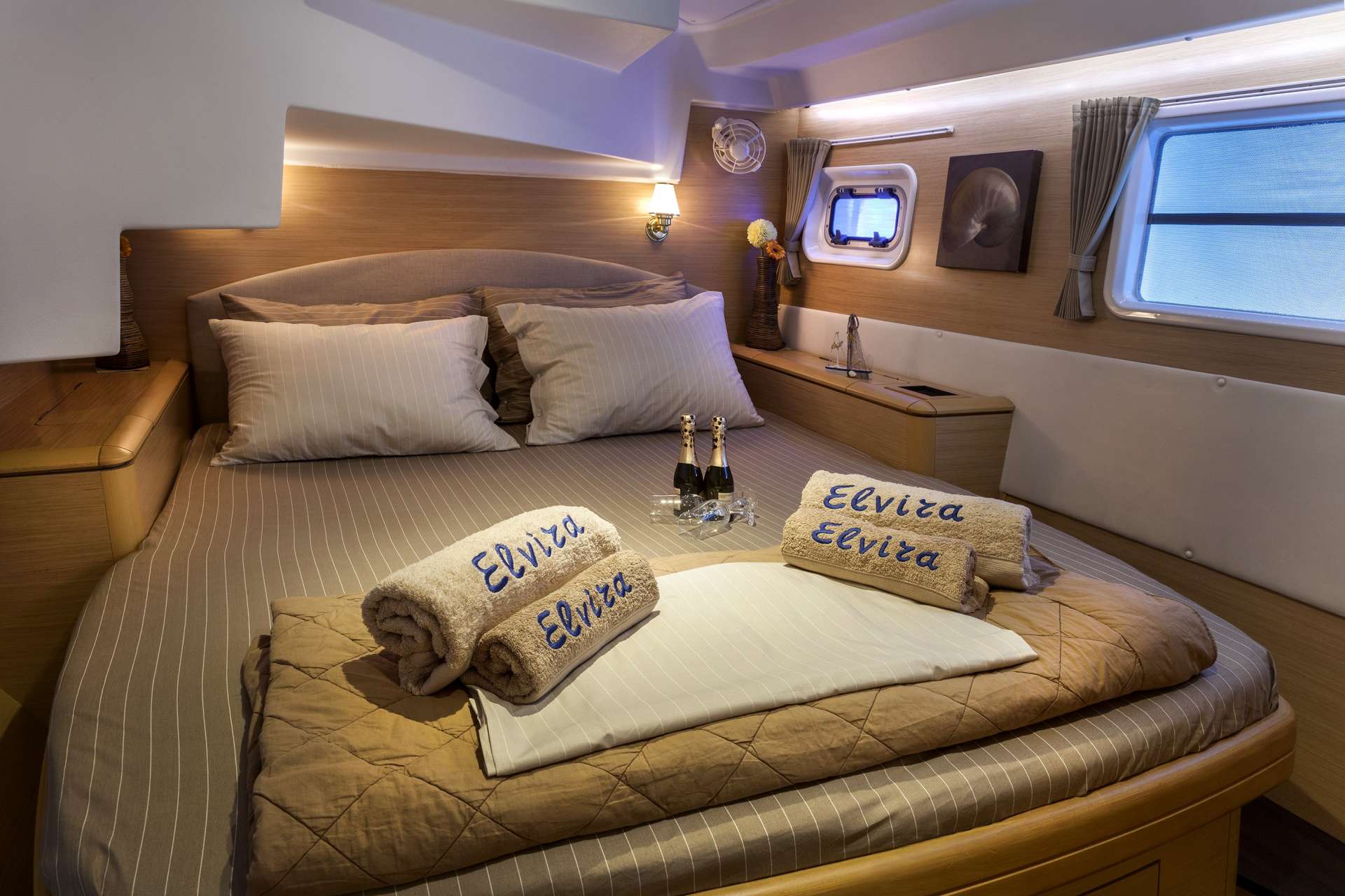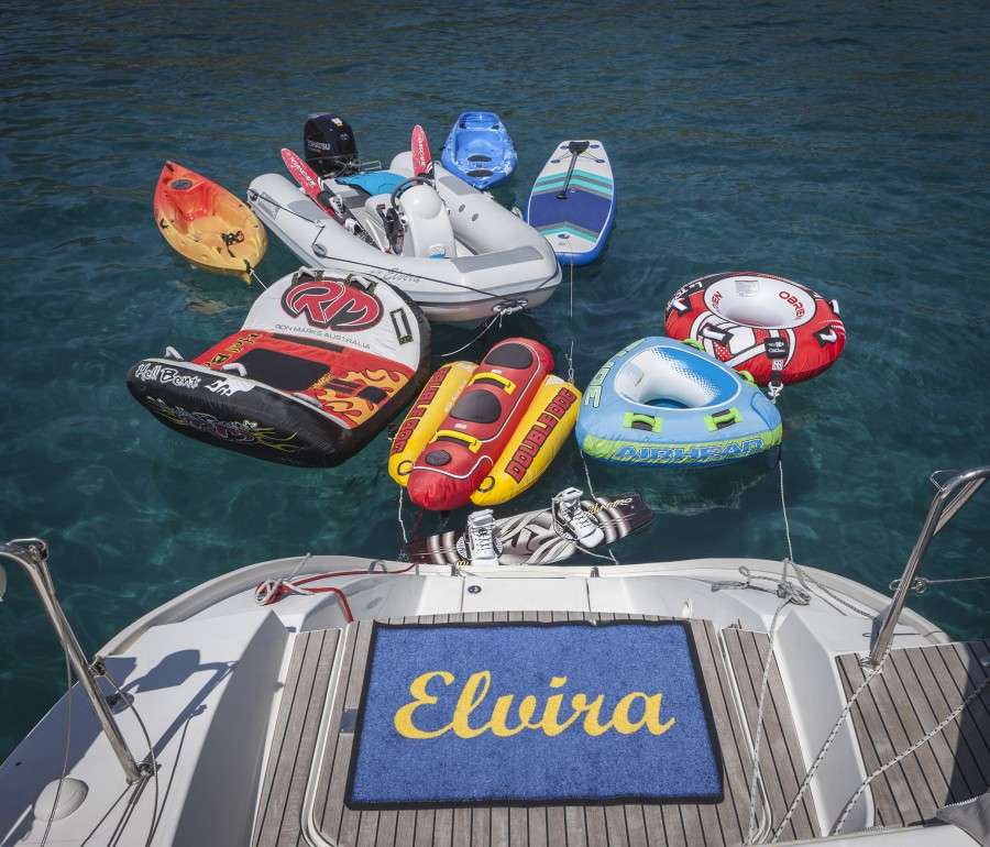 S/Y ELVIRA has excellent deck area, over 2 levels. Her aft deck is shaded with wrap around seating and alfresco dining, a service station on the port side offers cool drinks and storage. Numerous sun pads adorn the foredeck, as well as 2 safety trampolines, which double as fantastic sunning areas. A flybridge features a long stretch of seating, where charter guests may join the captain as he navigates the beautiful East Mediterranean seas.