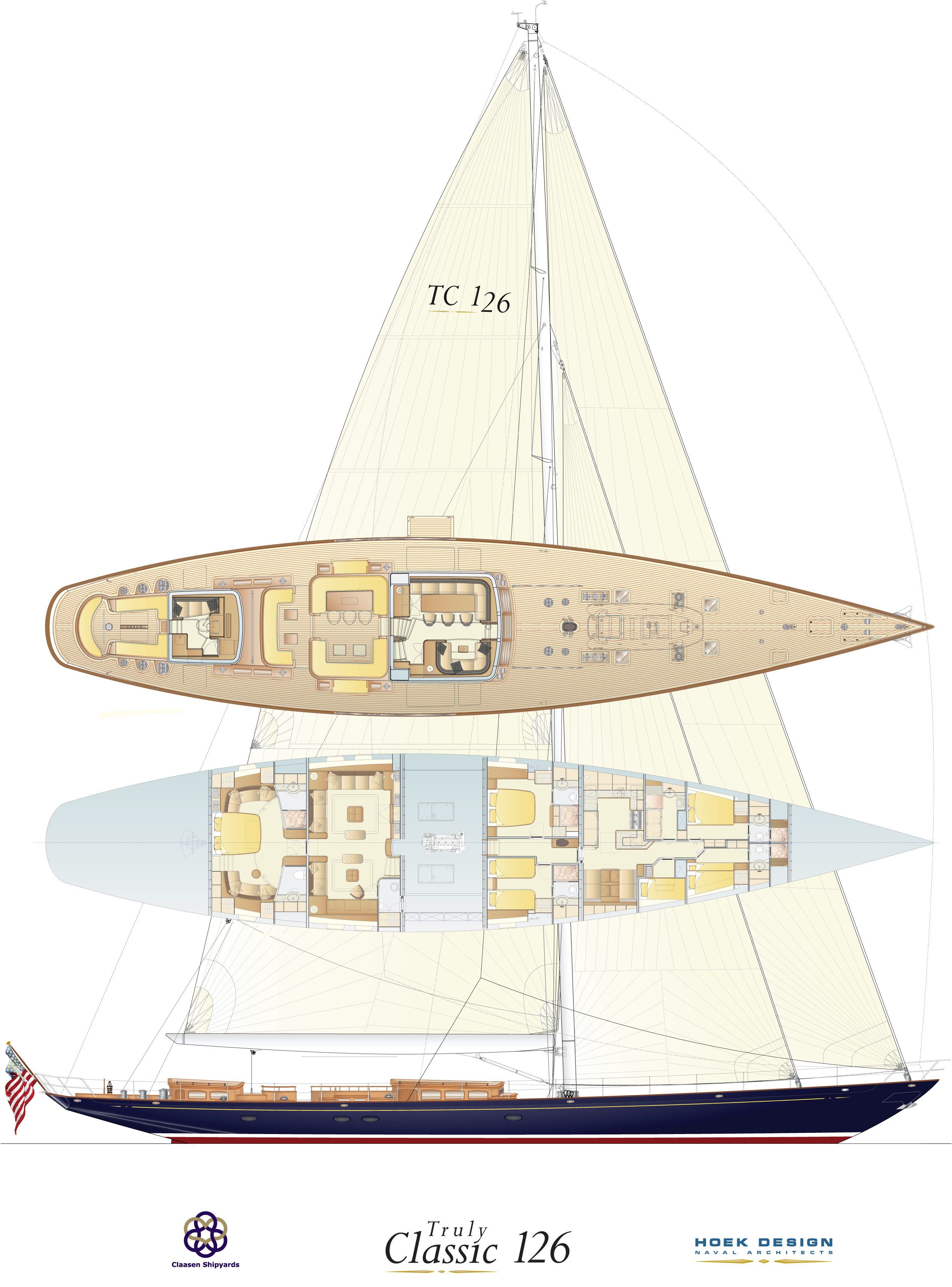 The renowned Dutch naval architecture studio – Hoek Design – has announced signing of a new contract for an exhilarating new model from the Truly Classic series. Measuring 38,40 metres, the sailing yacht TC126 will become the largest Truly Classic to date, bringing together all the developments of recent years, including versatility, layout, performance, keel configuration and sail plan. The TC 126 yacht project is for a repeat customer and will be constructed by Claasen Shipyards, with MCM representing the owner. The construction will commence in January, 2013.