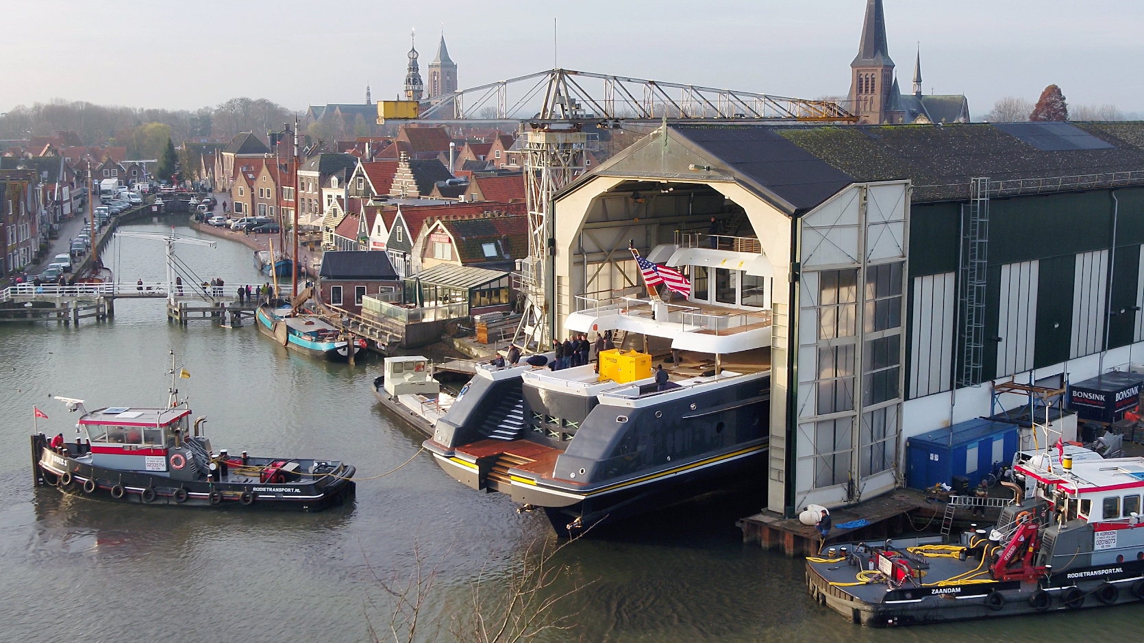 Motor yacht SCOUT about to hit water at Hakvoort Shipyard