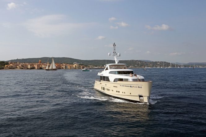 LOA: 77m/273ft ǀ Built: 2015 ǀ Guests: 12 ǀ Cabins: 8 ǀ Crew: 17 ǀ Notable features: Approved RYA Water Sports Centre, massage room, sundeck Jacuzzi, helipad