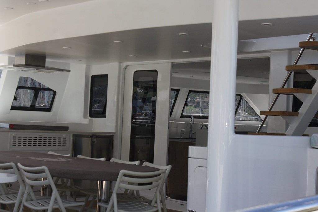 The main saloon of luxury yacht ADVENTUM is spacious, with a top class galley being part of this area. There is also a state-of-the-art navigation station in the corner of the main saloon. ADVENTUM boasts two generous aft cockpits – one upper and one lower – both protected from the sun and the elements. The lower aft cockpit is fitted out with an outdoor galley, while the upper cockpit on the flybridge is the main command centre of the catamaran, from where one drives the vessel, sheltered from the elements.