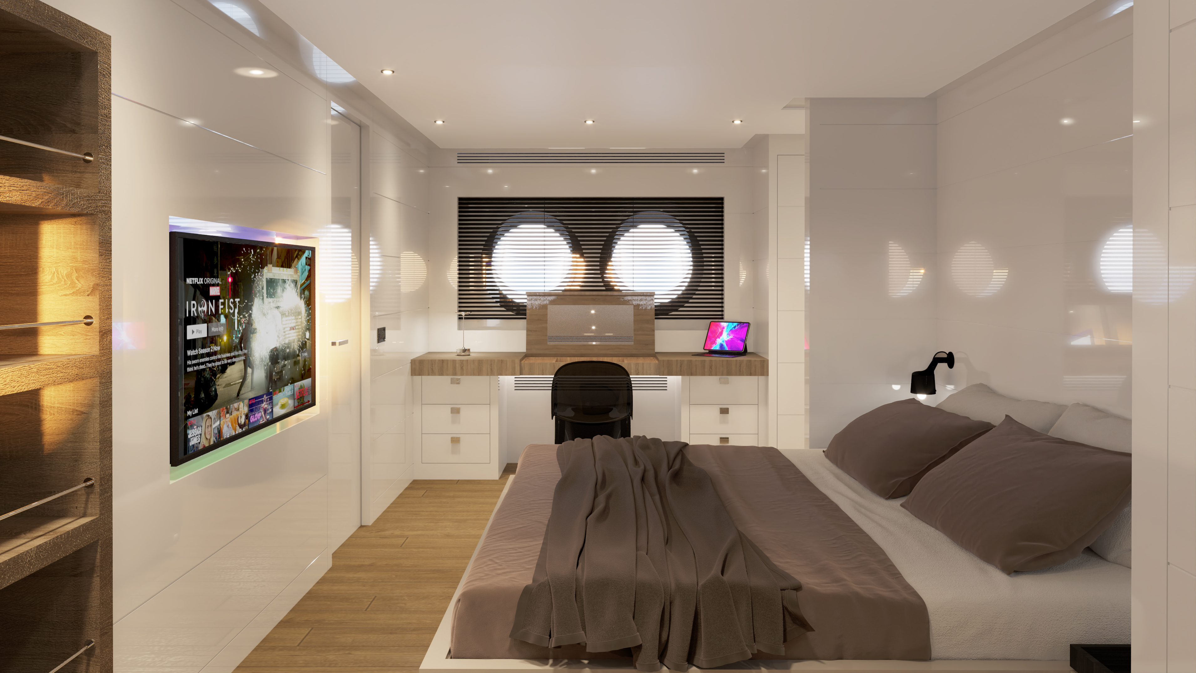 The military inspired exterior and beach-house style interior are both from Riza Tansu with the signature design philosophy from their Tiger shark series. The steel hull and aluminium superstructure boast naval architecture by Endaze blending bold aesthetics with practicality. Interior furnishings from Paola Lenti – in collaboration with B&B Furniture – are functional yet elegant and are well positioned in the light-filled surroundings. Warm wood flooring and white panelling complete the relaxed atmosphere and give the yacht a distinctive edge.