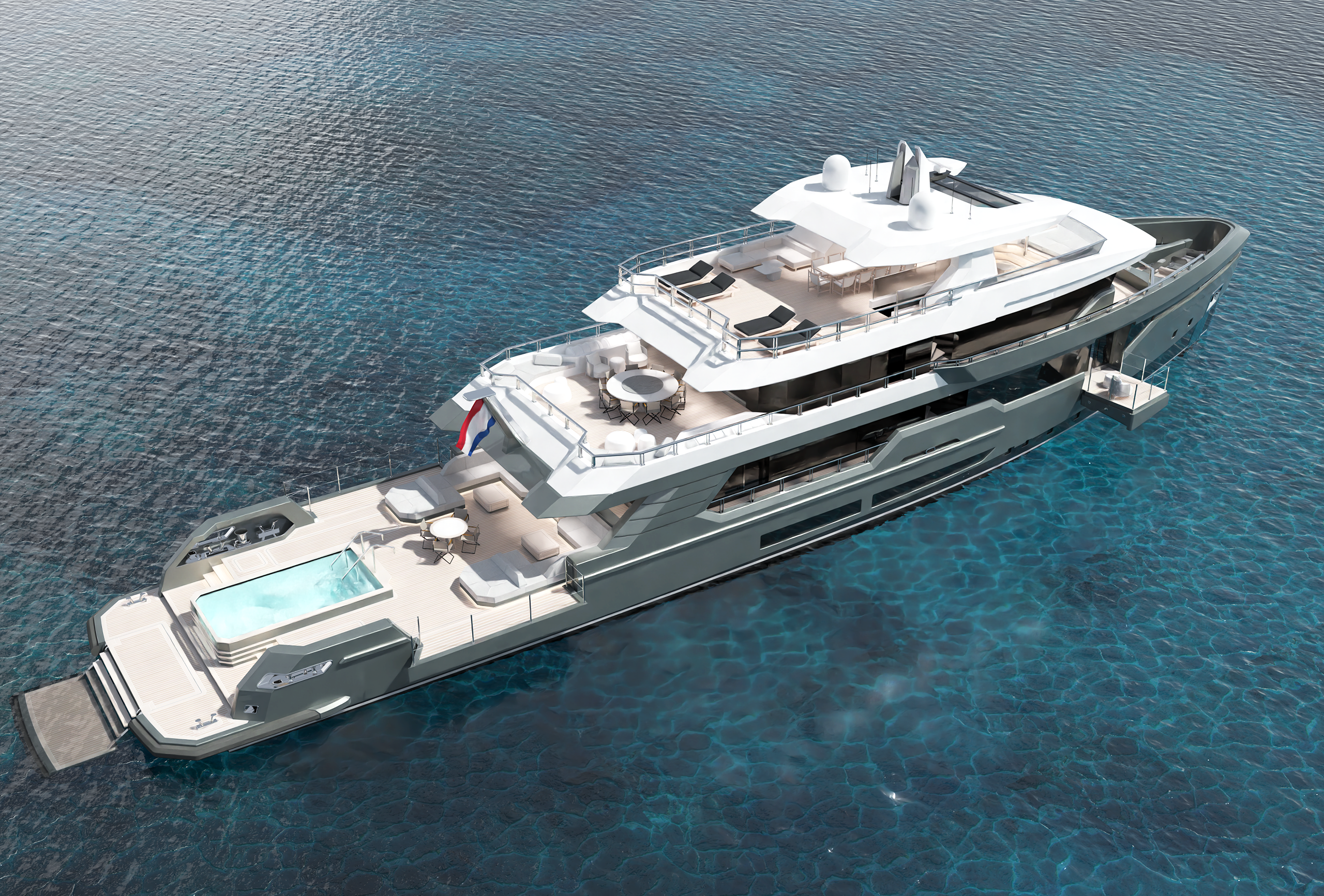 Luxury living includes six spacious guest cabins, with options for a seventh cabin or expanded sky lounge. The main deck’s guest cabin space can be customized into a gym, wellness area, or extended master suite. The owner’s stateroom includes a super king-size bed and ample wardrobe space, with an option for aft facing on the upper deck. Fully accessibility throughout with a wheelchair-accessible lift, the design ensures seamless movement throughout, enhancing privacy by minimizing friction between guests and crew.