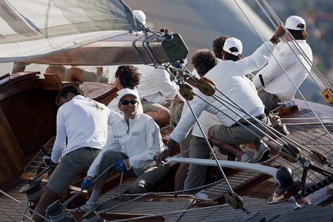 This year there were 14 challenges, with the center stage today a battle of the giant Fifes for the Club 55 Cup: the 40 metre cutter-rigged Cambria versus Mariquita, the 38 metre gaff cutter. The course was 15 nautical miles from the start off St Tropez around the Nioulargue mark, then to the finish line off Pampelonne beach. The other challengers agreed to courses – of varying lengths depending on conditions – between themselves. Today’s breeze of eight knots at the start, built to 15 knots during the day, before dropping off again towards the end of racing. In a rematch, and replay of last year, it was Cambria who beat Mariquita.