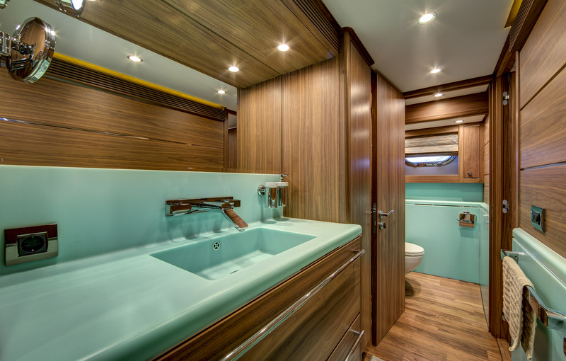 To give the interiors of SELENA yacht a more modern look and create an unusual colour contrast, the dark brown walnut containing grey and black grains has been used, with contemporary details in steel and acrylic stone. HI-MACS®, used predominantly in the bathrooms and kitchen, proved vital in this sense: the new generation acrylic stone is in fact rich in those characteristics which helped make the project a success, not only in terms of aesthetics by also function.