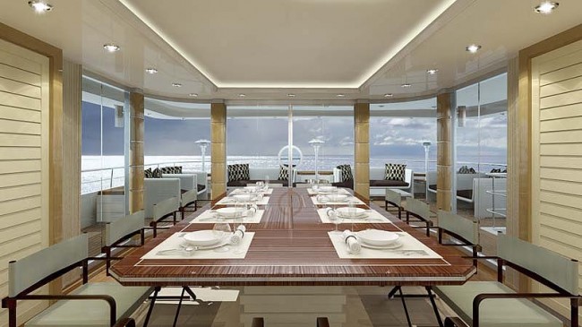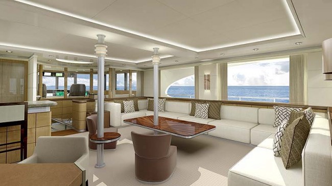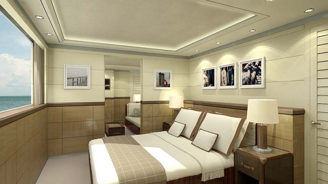 Alexander Isaac says “A contract has been signed with the Cheoy Lee yard and building is due to start in October with an anticipated construction time of 13 months. I would say the flexibility of the guest accommodation is the standout feature: six guest cabins—either double or twins or a combination thereof—can be converted into three suites with sitting rooms, or a combination of any of those arrangements.”