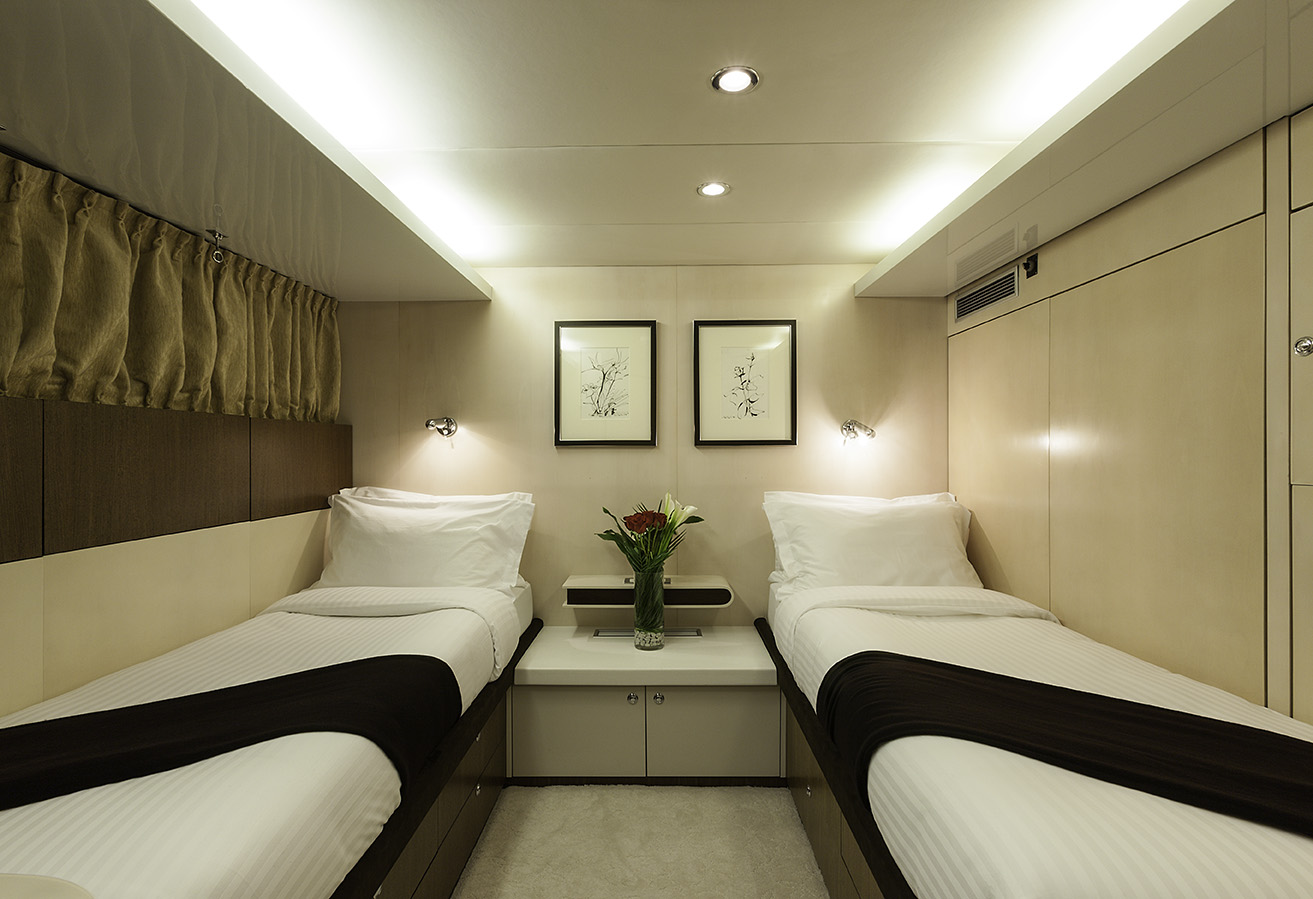 The accommodation sleeps up to 12 guests over 5 cabins: 1 Master suite, 1 VIP stateroom, 2 double cabins (1 with 2 additional berths) and 1 twin cabin. The experienced crew of 18 will provide everything you and your guests require for an exceptional holiday among such incredible destinations as the Grenadines or the Turks & Caicos Islands.