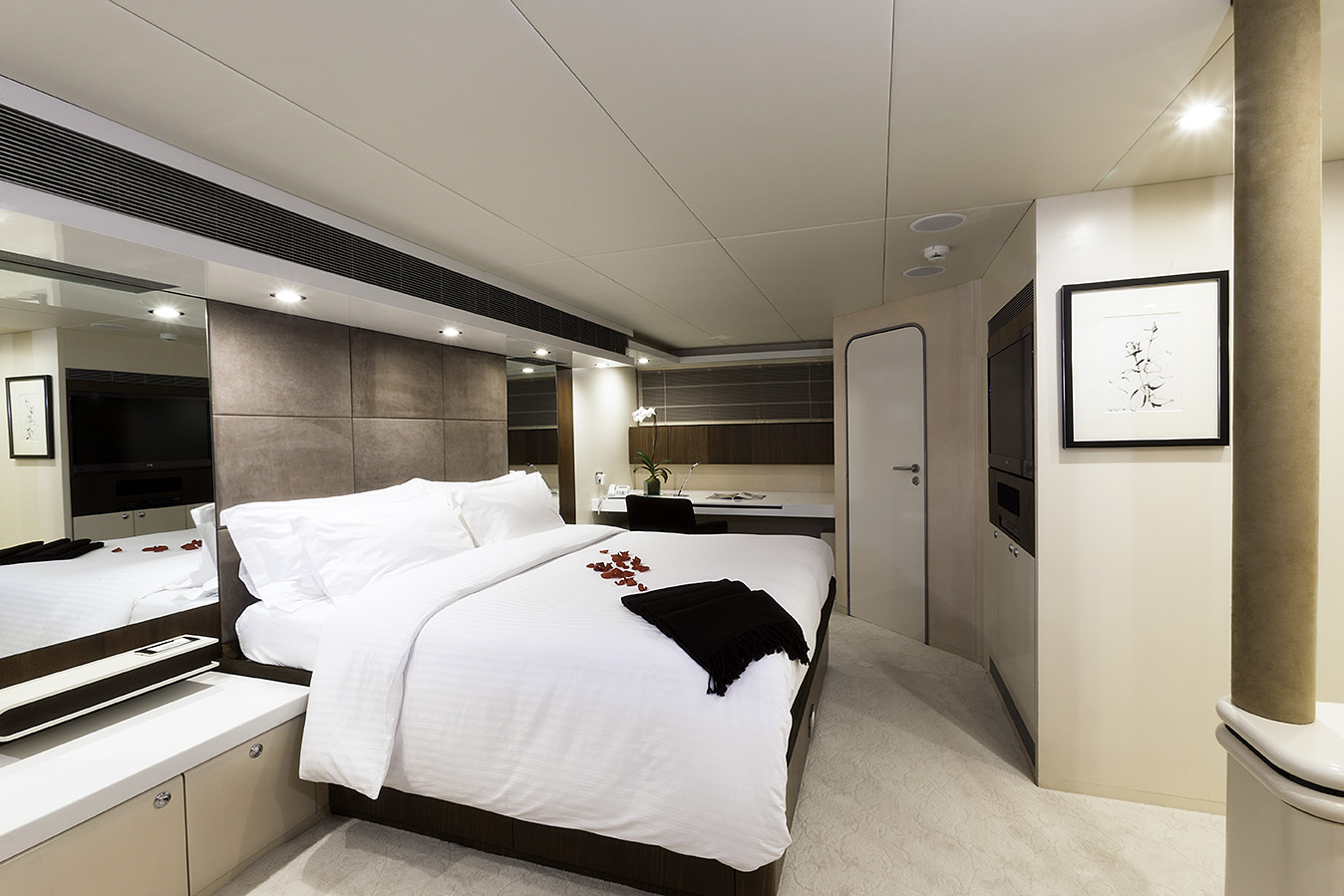 The Master suite is located on the main deck for greater natural light and plenty of space for an en-suite bathroom, workspace and lounge. The main salon and formal dining area create one large and impressive living area, where pale white walls complement the ivory fabrics and accents in chocolate brown, caramel and topaz blue.