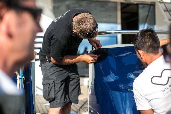 Last week, April 23, 2015 in Port Vauban, nestled in the fantastic South of France yacht holiday location – Antibes, saw Wild Group International demonstrate a live vinyl film application aboard motor yacht Naomi S. The event was a resounding success and was attended by over 30 captains and industry professionals, including Monaco Marine, IMS Shipyard, Sunseeker, as well as Dubois Naval Architects.