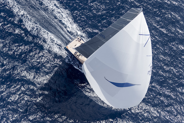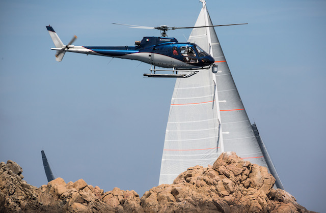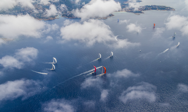 As the kites popped to the south of Soffi Island, the fast yachts were already starting to make good progress through the fleet, and by the time they had completed the long downwind leg to a mark at the entrance to bomb alley off Caprera, Magic Carpet 3 and Open Season – the last yachts to start – had ripped through the fleet. Magic Carpet 3 held a 1m 05s advantage, and after Open Season had started the close reach to Monaci there was another four minutes before Grande Orazio made it round the buoy. There followed another huge cluster, with sailing yachts My Song, Firefly, Moonbird, Gaia, Whisper, Selene, Ghost, Inoui, Windfall, Ganesha, Unfurled and Cape Arrow all rounding within five minutes of each other – some of them separated by only a few seconds.