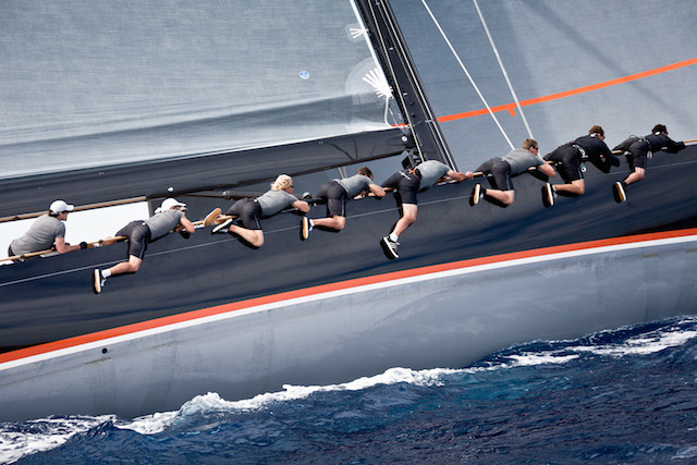 ‘You have the Pantaenius laser rangefinder where you try to monitor the distance [between yachts],’ explains Francesco de Angelis, tactician aboard My Song. ‘It’s easy when you have to deal with just one yacht but it gets complicated when there are a few “customers” around. It’s not like a car where you can touch the brake and slow down – you have to think ahead and hopefully you don’t get a big puff at the wrong moment!’