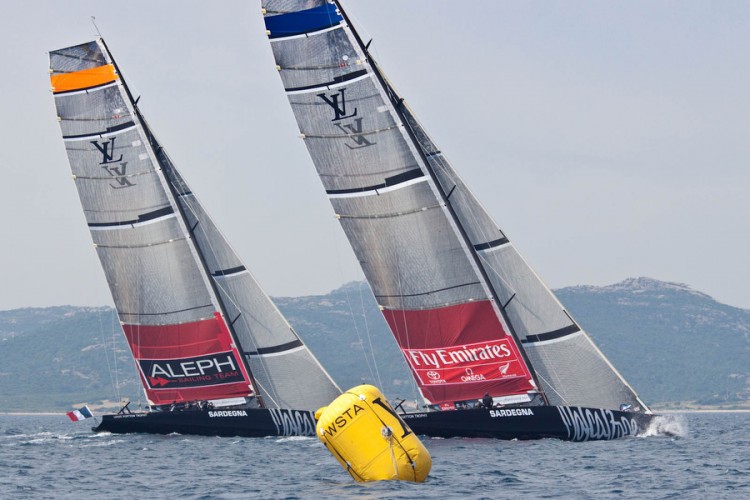 Flight Fifteen, Race Two: TEAMORIGIN def Synergy Russian Sailing Team, 00:06 – ORIGIN was bow-out in mid-line at the start with Synergy close to the committee boat. The Russians hung tough on the starboard tack but were forced away after two minutes. They led approaching the starboard layline, only to drop back in a left shift that put Ainslie ahead by 14 seconds at the top mark. The boats rounded opposite leeward marks. ORIGIN conceded valuable seconds as the gennaker went under the bow but held a handy lead.