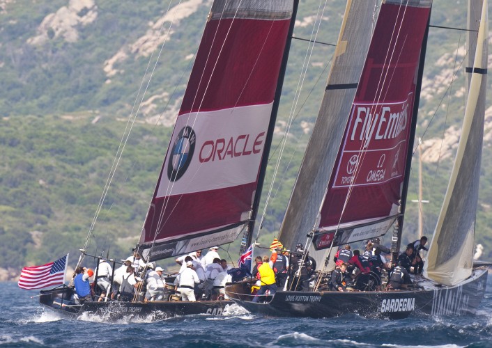 A hard-fought battle between Emirates Team New Zealand’s Dean Barker and BMW Oracle Racing’s James Spithill at the Louis Vuitton Trophy La Maddalena today went the Kiwis’ way when the American team lost a penalty call in an aggressive luffing match approaching the second weather mark.