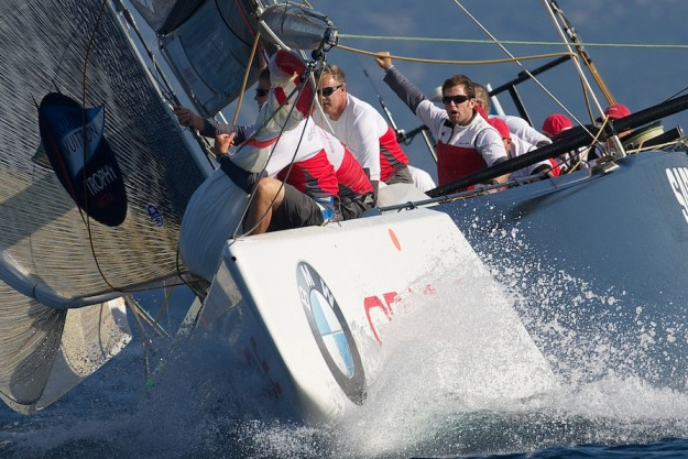 Wind aplenty today. Racing started in 12 knots of westerly breeze and began building as racing progressed. The day started with a plan to sail five flights of two races each, weather permitting, but a start line collision between ALEPH Sailing Team and Azzurra, for which the French boat was disqualified, will limit racing today.